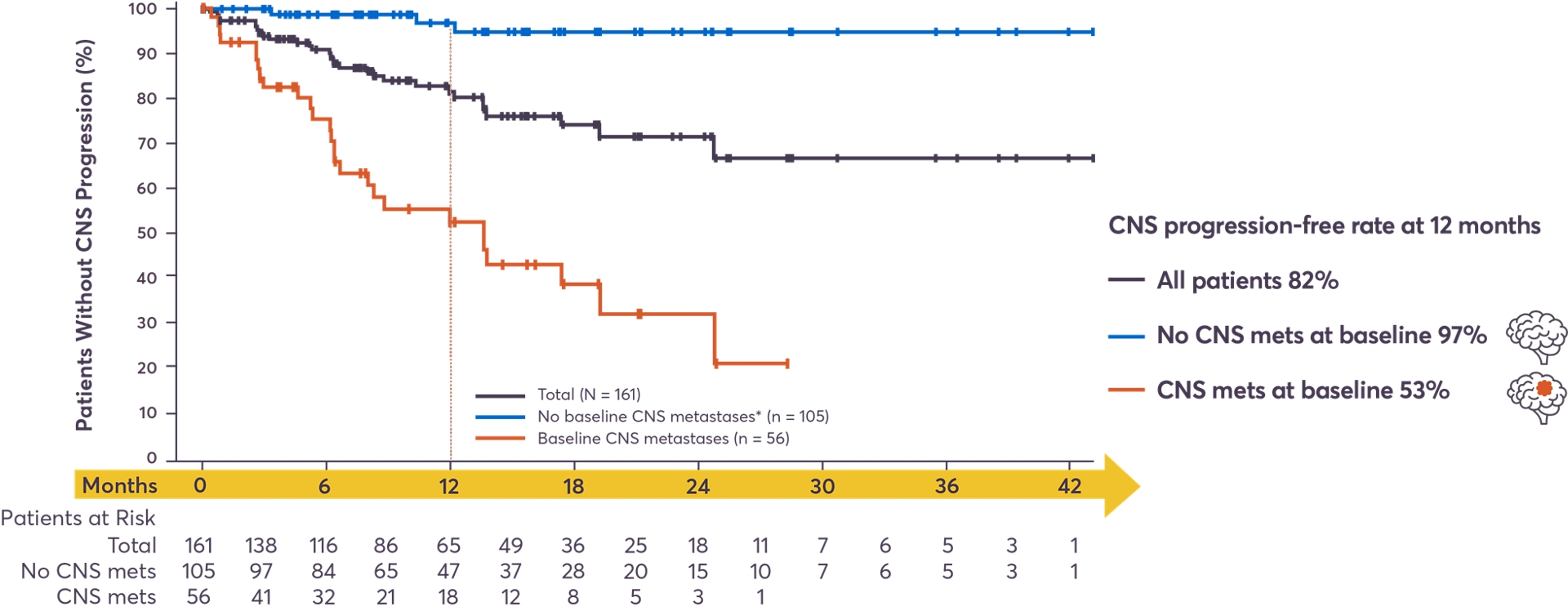 Baseline CNS metastases assessed by investigator. Time to CNS progression: only confirmed CNS progression counted as an event (death censored).